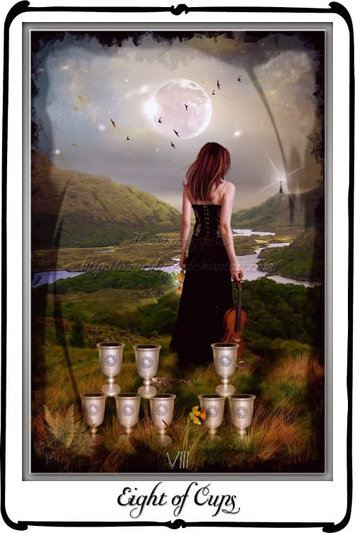Ósemka Kielichów oznacza okres przejściowy. To czas lub cykl w naszym życiu kiedy musimy ruszyć z miejsca, odejść od tego ,co zastane, pójść za nowym drogowskazem, przewartościować priorytety.W naszym życiu została zachwiana równowaga. W życiu nie ma nic stałego oprócz zmian, a ta karta przypomina nam, że wszystko idzie do przodu lub się oddala. Ludzie opuszczają nas, my opuszczamy ich ,tracimy coś ale też i zyskujemy.Przy pytaniach dotyczących związku ,karta ta mówi że albo my oddalamy się od partnera, albo on od nas. Tak jakby każdy miał iść inną drogą.Jeśli jesteś samotny karta ta daje do zrozumienia, że będziesz musiał od kogoś lub czegoś odejść i wejść na nową ścieżkę życia by poznać kogoś interesującego.