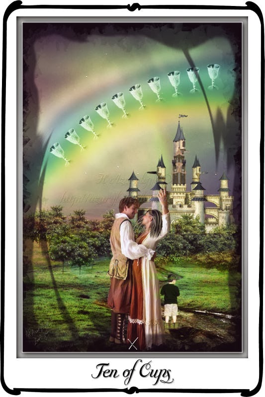 Dziesiątka Kielichów wskazuje, że radość której szukamy jest w zasięgu ręki. Nadszedł czas by odetchnąć z ulgą i przygotować się na nadejście dobrych czasów w miłości.Karta ta określa związek partnerski bardzo szczęśliwy, spełnienie w małżeństwie oraz założenie rodziny.